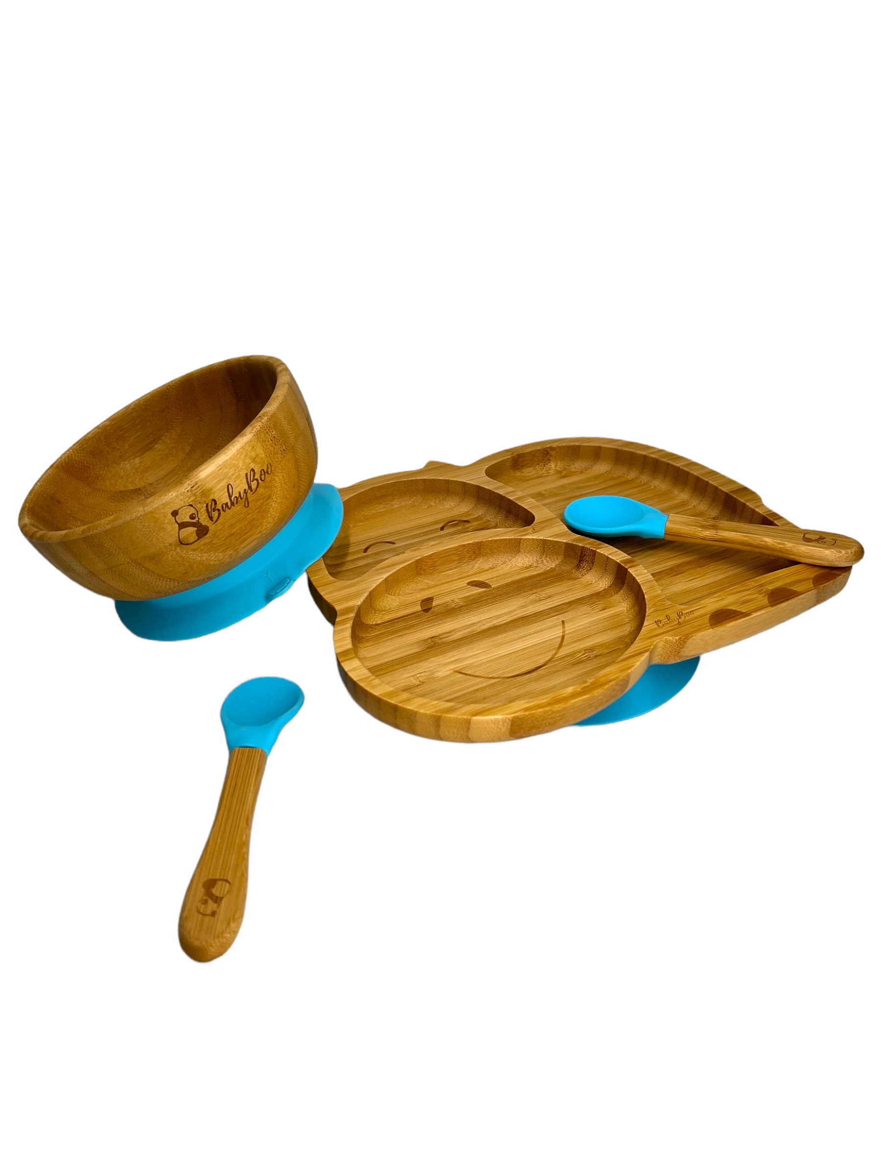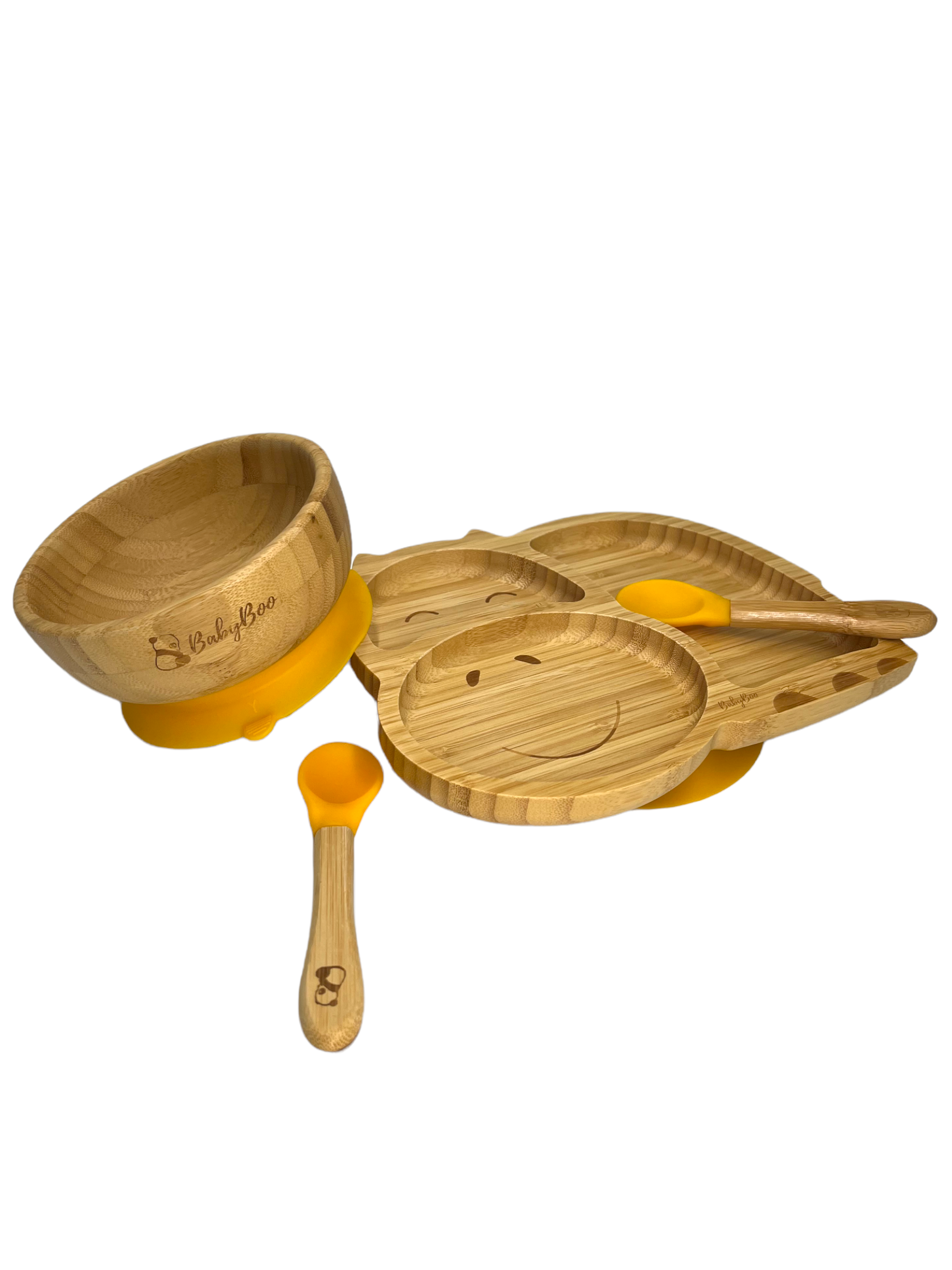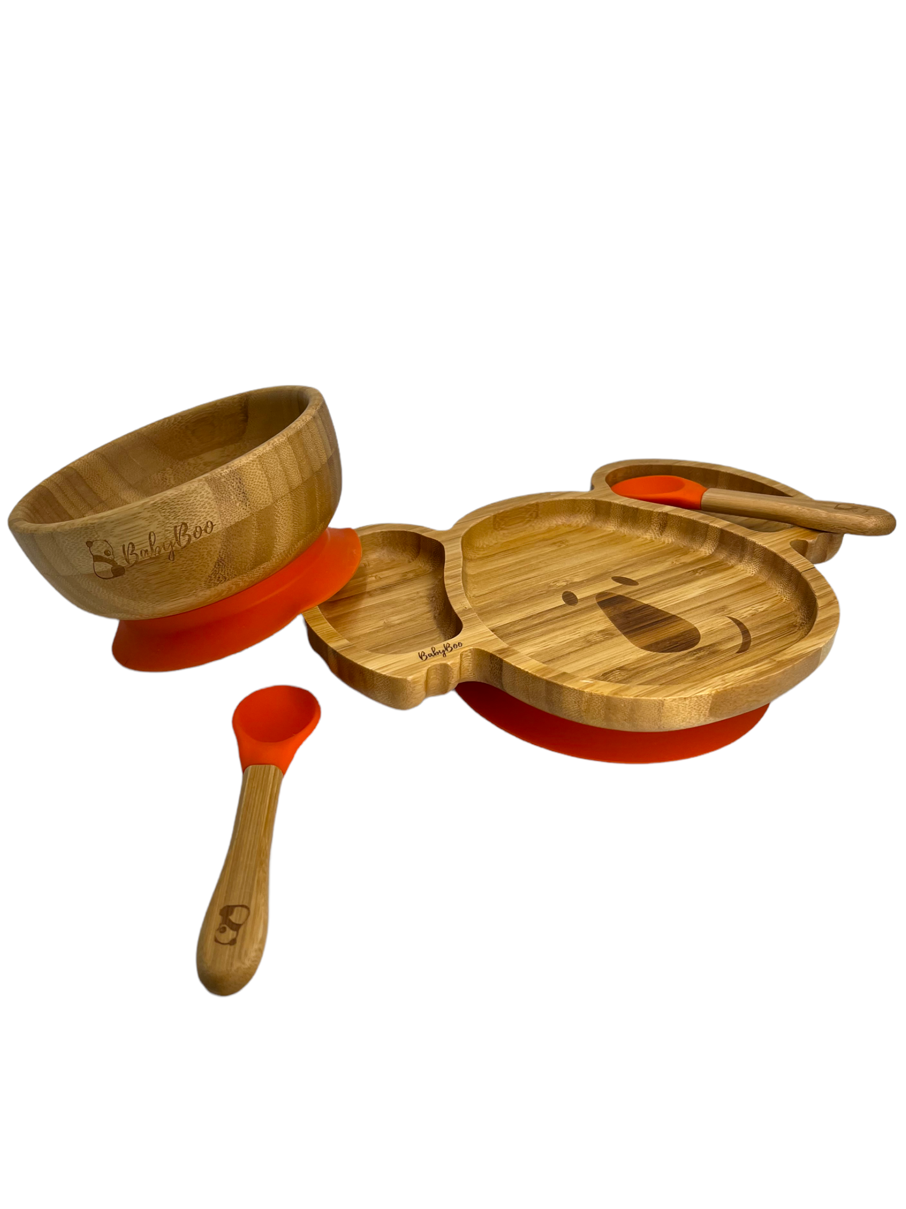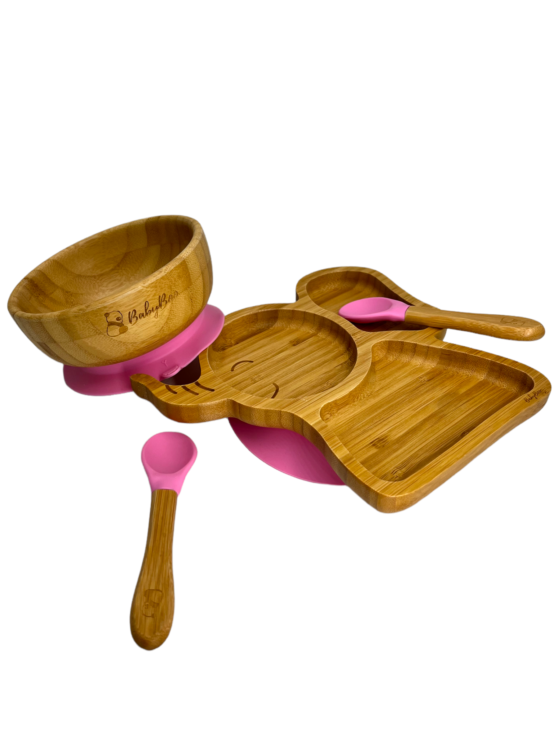 Somos un set de un bowl y un plato de bambú con una súper ventosa, nuestra base de succión de silicona desmontable viene en seis colores y funciona con un mecanismo hermético para asegurar que me agarre firmemente a la silla de comer, mesa o superficie plana.